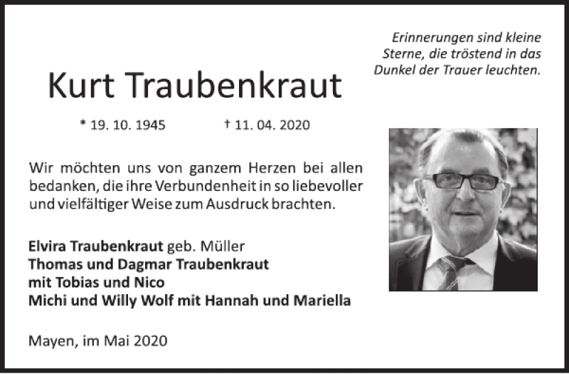 Hier finden Sie alle Traueranzeigen aus der Zeitung, die bisher für Kurt Traubenkraut erschienen sind. Weitere Traueranzeigen, die in der Zeitung erscheinen, werden hier ebenfalls aufgelistet