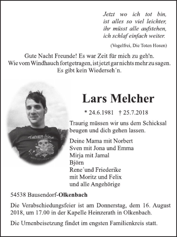 Hier finden Sie alle Traueranzeigen aus der Zeitung, die bisher für Lars Melcher erschienen sind. Weitere Traueranzeigen, die in der Zeitung erscheinen, werden hier ebenfalls aufgelistet