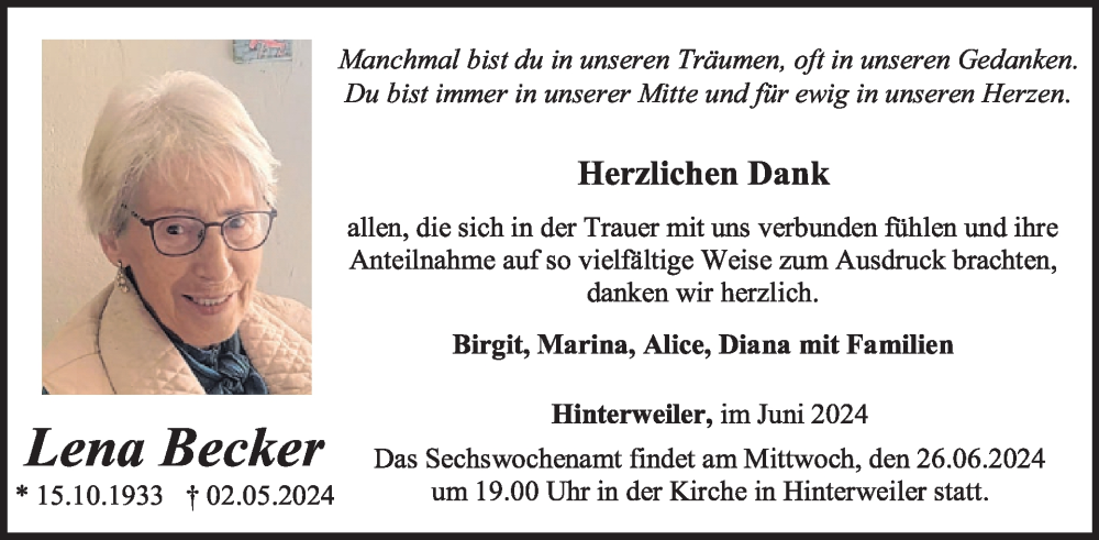 Hier finden Sie alle Traueranzeigen aus der Zeitung, die bisher für Lena Becker erschienen sind. Weitere Traueranzeigen, die in der Zeitung erscheinen, werden hier ebenfalls aufgelistet