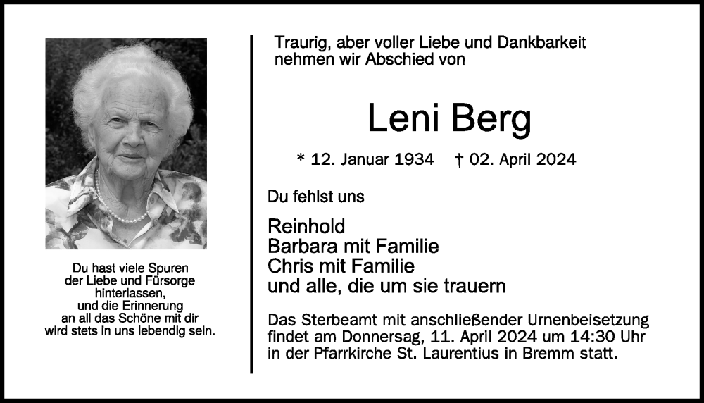 Hier finden Sie alle Traueranzeigen aus der Zeitung, die bisher für Leni Berg erschienen sind. Weitere Traueranzeigen, die in der Zeitung erscheinen, werden hier ebenfalls aufgelistet