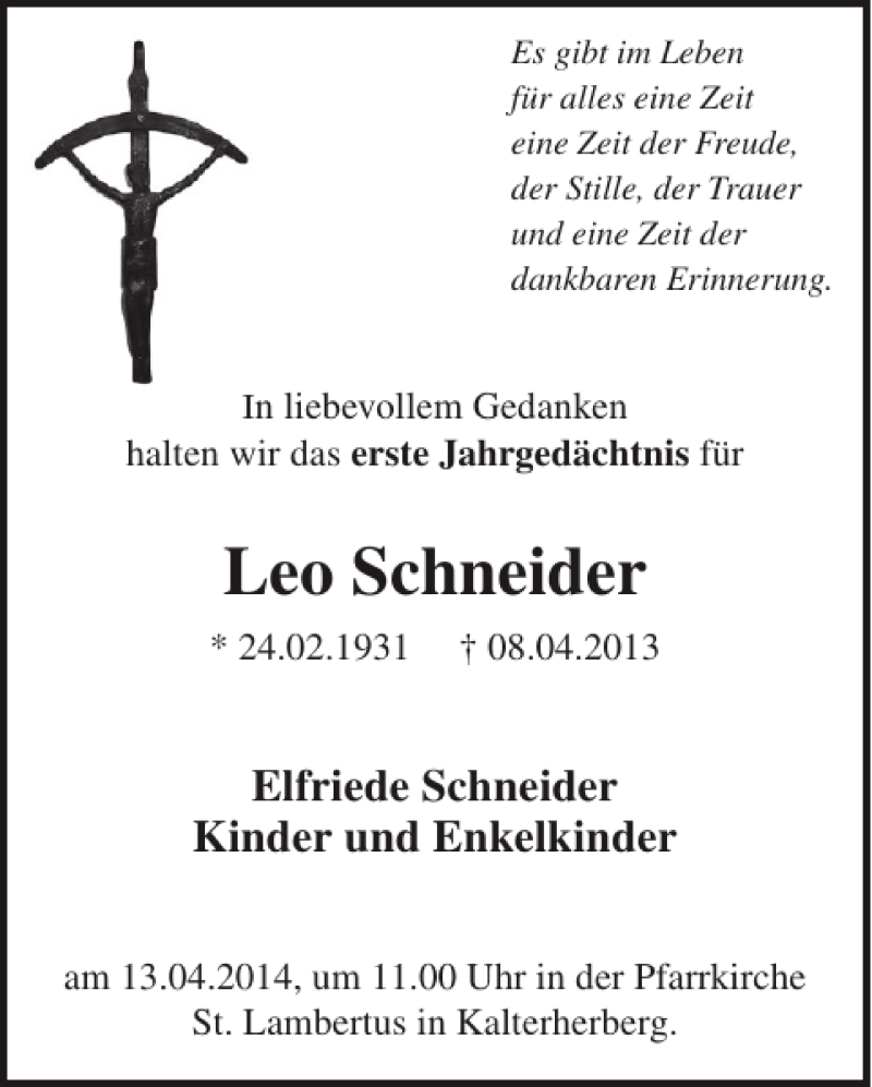Hier finden Sie alle Traueranzeigen aus der Zeitung, die bisher für Leo Schneider erschienen sind. Weitere Traueranzeigen, die in der Zeitung erscheinen, werden hier ebenfalls aufgelistet