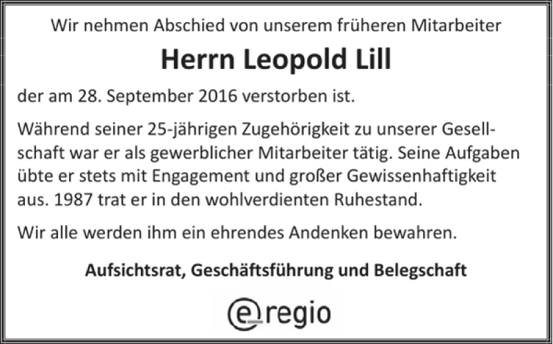 Hier finden Sie alle Traueranzeigen aus der Zeitung, die bisher für Leopold Lill erschienen sind. Weitere Traueranzeigen, die in der Zeitung erscheinen, werden hier ebenfalls aufgelistet