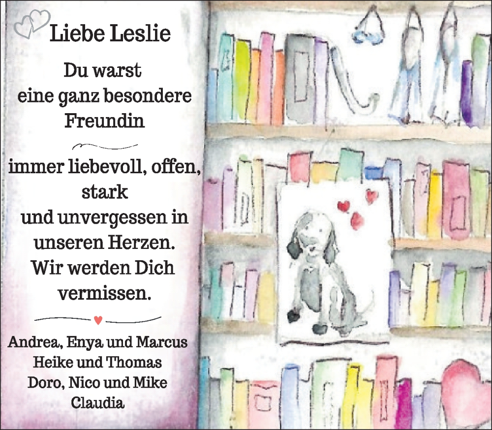 Hier finden Sie alle Traueranzeigen aus der Zeitung, die bisher für Leslie erschienen sind. Weitere Traueranzeigen, die in der Zeitung erscheinen, werden hier ebenfalls aufgelistet