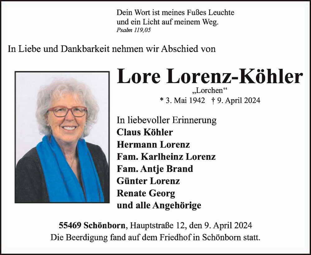 Hier finden Sie alle Traueranzeigen aus der Zeitung, die bisher für Lore Lorenz-Köhler erschienen sind. Weitere Traueranzeigen, die in der Zeitung erscheinen, werden hier ebenfalls aufgelistet