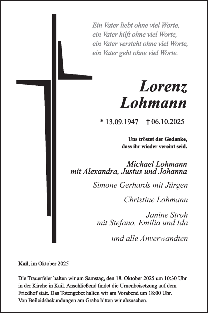 Hier finden Sie alle Traueranzeigen aus der Zeitung, die bisher für Lorenz Lohmann erschienen sind. Weitere Traueranzeigen, die in der Zeitung erscheinen, werden hier ebenfalls aufgelistet