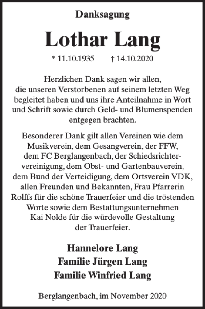 Hier finden Sie alle Traueranzeigen aus der Zeitung, die bisher für Lothar Lang erschienen sind. Weitere Traueranzeigen, die in der Zeitung erscheinen, werden hier ebenfalls aufgelistet