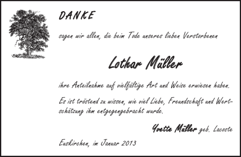 Hier finden Sie alle Traueranzeigen aus der Zeitung, die bisher für Lothar Müller erschienen sind. Weitere Traueranzeigen, die in der Zeitung erscheinen, werden hier ebenfalls aufgelistet