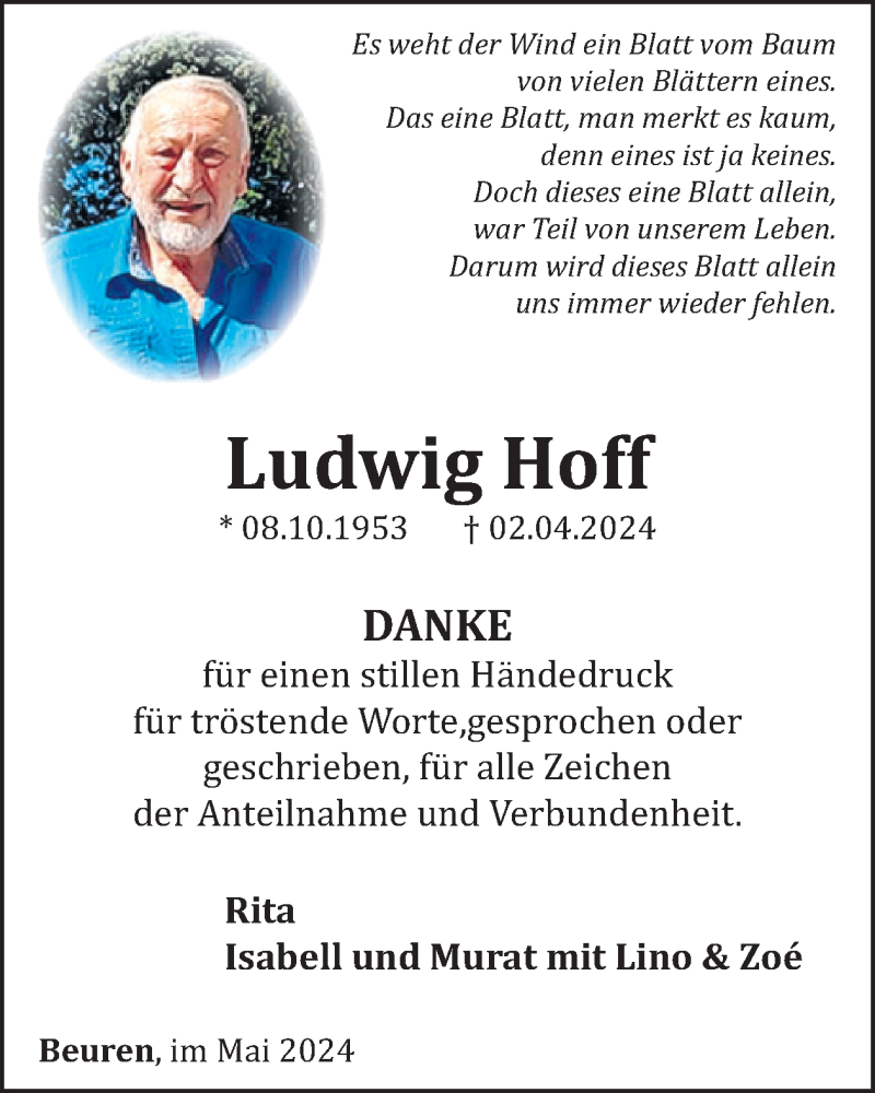 Hier finden Sie alle Traueranzeigen aus der Zeitung, die bisher für Ludwig Hoff erschienen sind. Weitere Traueranzeigen, die in der Zeitung erscheinen, werden hier ebenfalls aufgelistet