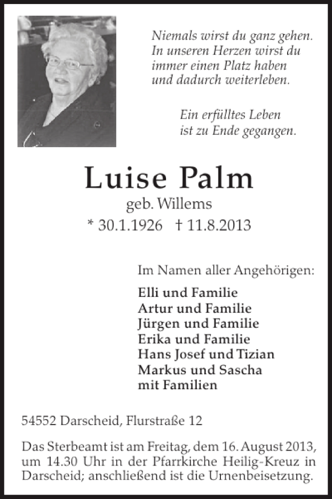 Hier finden Sie alle Traueranzeigen aus der Zeitung, die bisher für Luise Palm erschienen sind. Weitere Traueranzeigen, die in der Zeitung erscheinen, werden hier ebenfalls aufgelistet