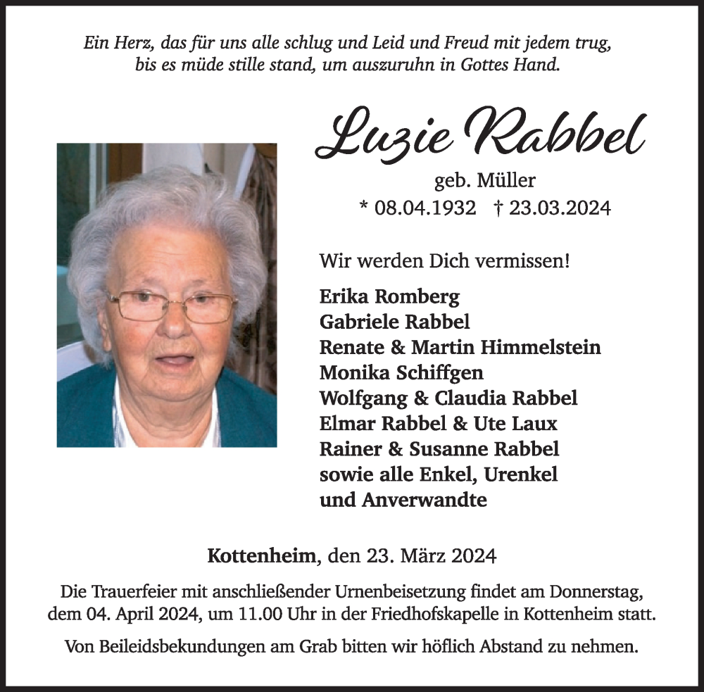 Hier finden Sie alle Traueranzeigen aus der Zeitung, die bisher für Luzie Rabbel erschienen sind. Weitere Traueranzeigen, die in der Zeitung erscheinen, werden hier ebenfalls aufgelistet