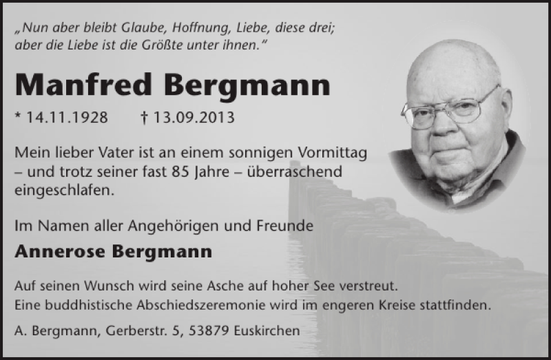 Hier finden Sie alle Traueranzeigen aus der Zeitung, die bisher für Manfred Bergmann erschienen sind. Weitere Traueranzeigen, die in der Zeitung erscheinen, werden hier ebenfalls aufgelistet