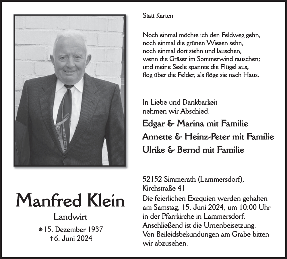 Hier finden Sie alle Traueranzeigen aus der Zeitung, die bisher für Manfred Klein erschienen sind. Weitere Traueranzeigen, die in der Zeitung erscheinen, werden hier ebenfalls aufgelistet