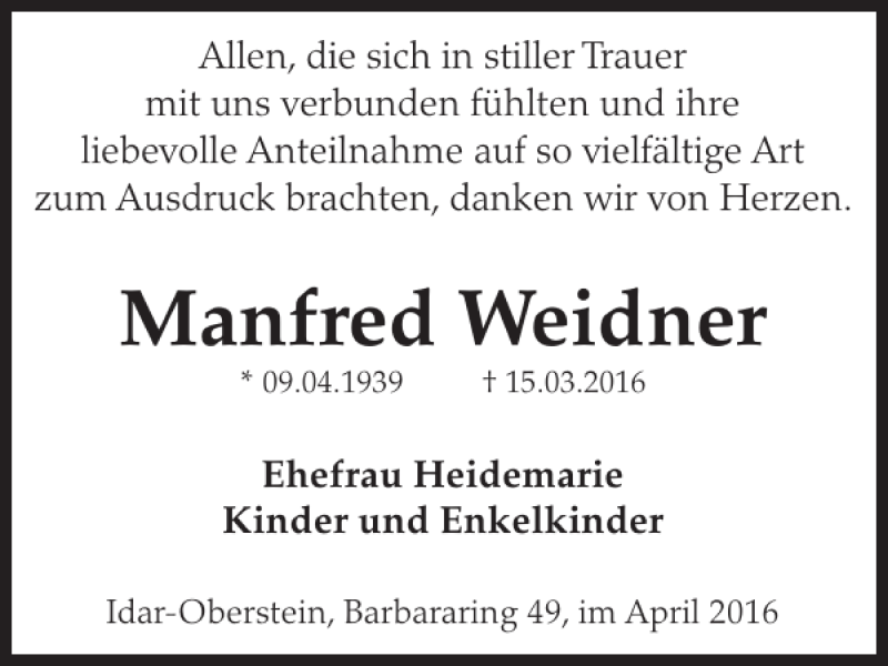 Hier finden Sie alle Traueranzeigen aus der Zeitung, die bisher für Manfred Weidner erschienen sind. Weitere Traueranzeigen, die in der Zeitung erscheinen, werden hier ebenfalls aufgelistet