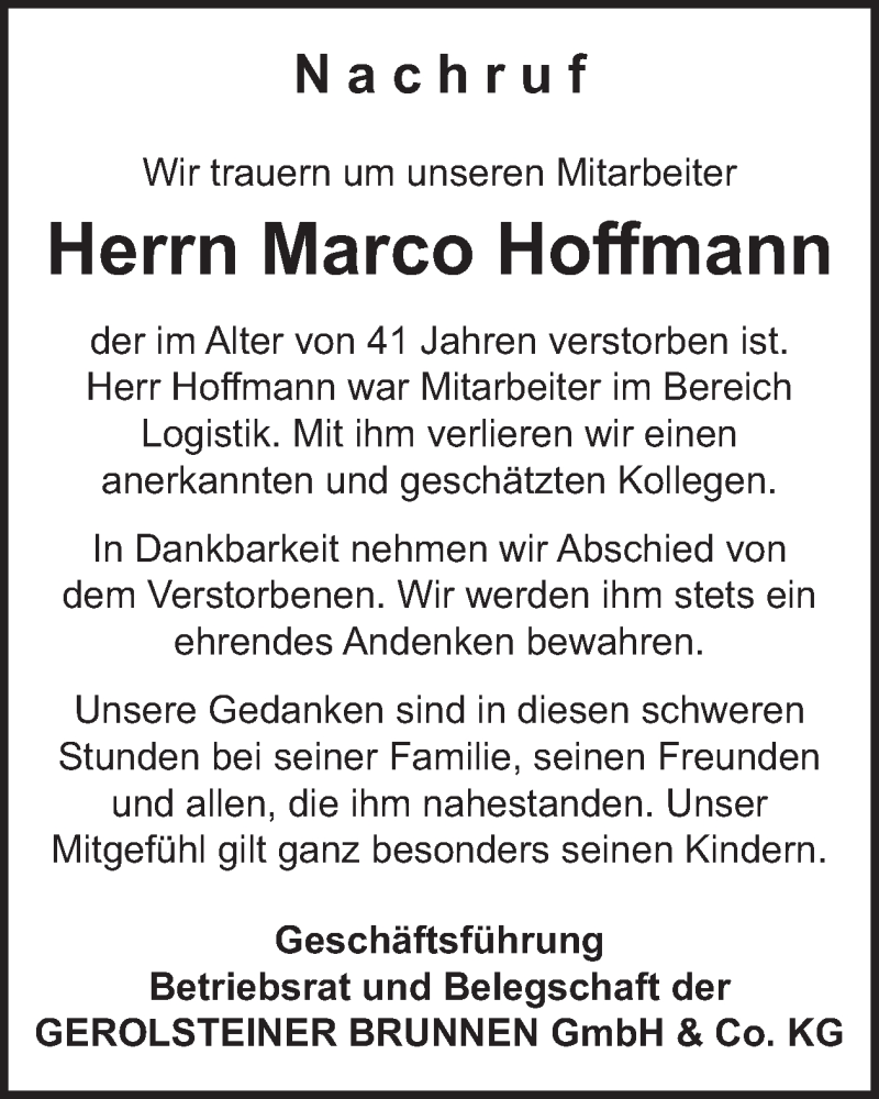Hier finden Sie alle Traueranzeigen aus der Zeitung, die bisher für Marco Hoffmann erschienen sind. Weitere Traueranzeigen, die in der Zeitung erscheinen, werden hier ebenfalls aufgelistet