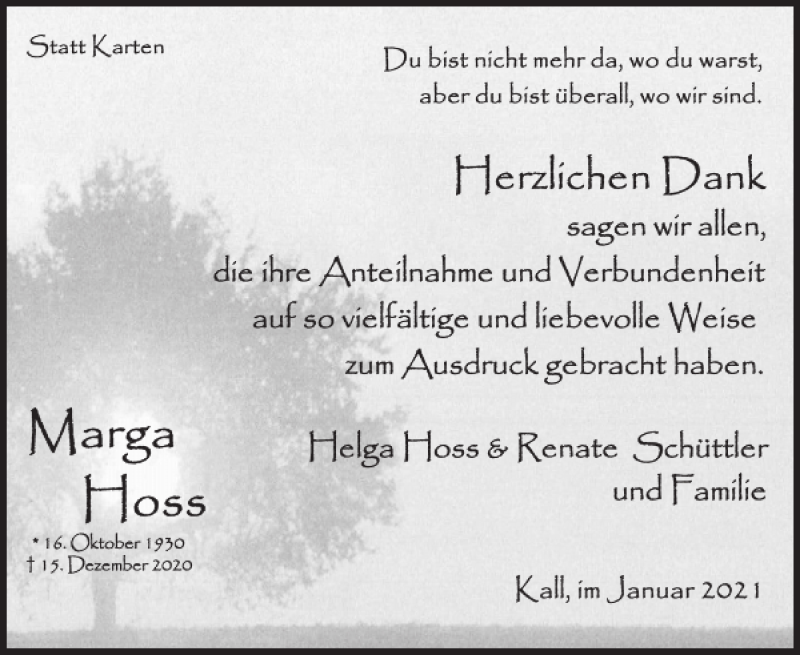 Hier finden Sie alle Traueranzeigen aus der Zeitung, die bisher für Marga Hoss erschienen sind. Weitere Traueranzeigen, die in der Zeitung erscheinen, werden hier ebenfalls aufgelistet
