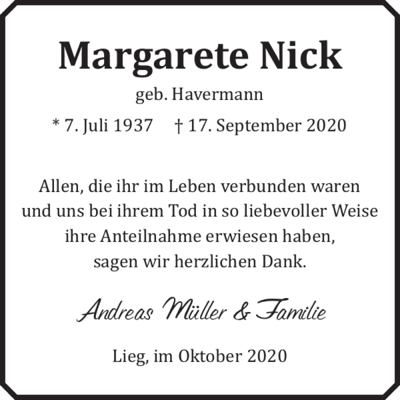 Hier finden Sie alle Traueranzeigen aus der Zeitung, die bisher für Margarete Nick erschienen sind. Weitere Traueranzeigen, die in der Zeitung erscheinen, werden hier ebenfalls aufgelistet