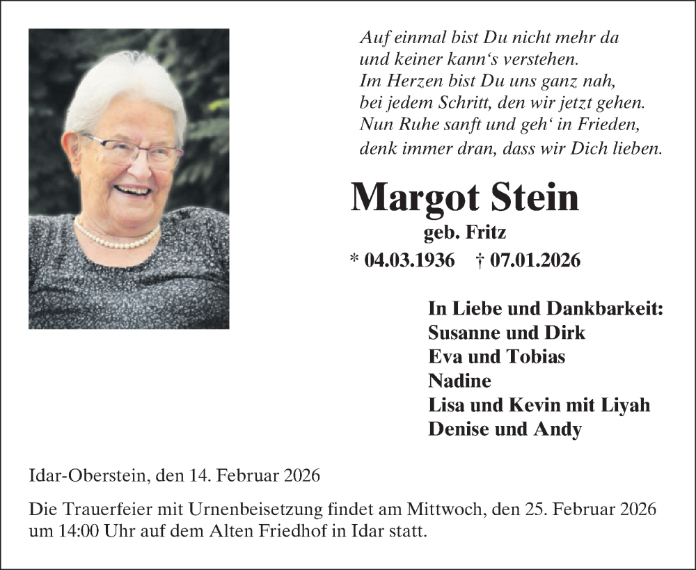 Hier finden Sie alle Traueranzeigen aus der Zeitung, die bisher für Margot Stein erschienen sind. Weitere Traueranzeigen, die in der Zeitung erscheinen, werden hier ebenfalls aufgelistet