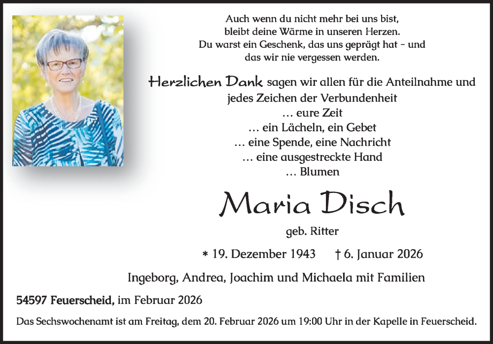 Hier finden Sie alle Traueranzeigen aus der Zeitung, die bisher für Maria Disch erschienen sind. Weitere Traueranzeigen, die in der Zeitung erscheinen, werden hier ebenfalls aufgelistet