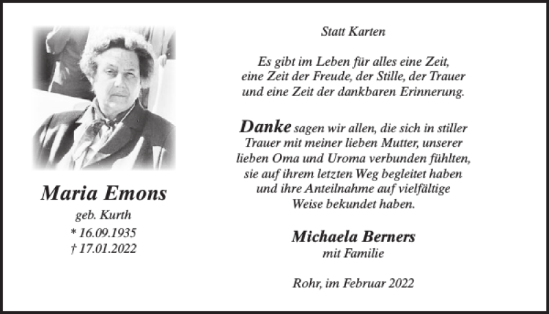 Hier finden Sie alle Traueranzeigen aus der Zeitung, die bisher für Maria Emons erschienen sind. Weitere Traueranzeigen, die in der Zeitung erscheinen, werden hier ebenfalls aufgelistet