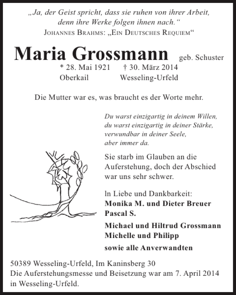 Hier finden Sie alle Traueranzeigen aus der Zeitung, die bisher für Maria Grossmann erschienen sind. Weitere Traueranzeigen, die in der Zeitung erscheinen, werden hier ebenfalls aufgelistet
