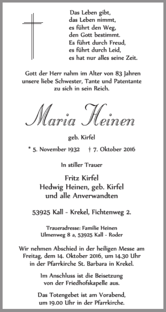 Hier finden Sie alle Traueranzeigen aus der Zeitung, die bisher für Maria Heinen erschienen sind. Weitere Traueranzeigen, die in der Zeitung erscheinen, werden hier ebenfalls aufgelistet