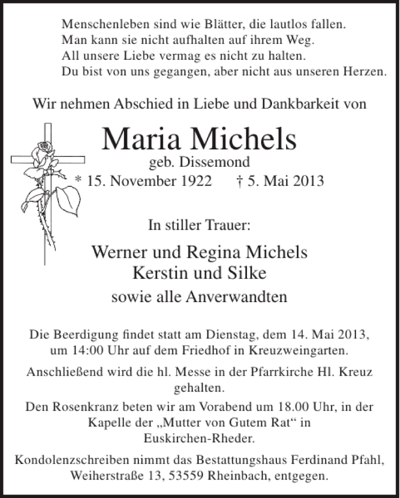 Hier finden Sie alle Traueranzeigen aus der Zeitung, die bisher für Maria Michels erschienen sind. Weitere Traueranzeigen, die in der Zeitung erscheinen, werden hier ebenfalls aufgelistet