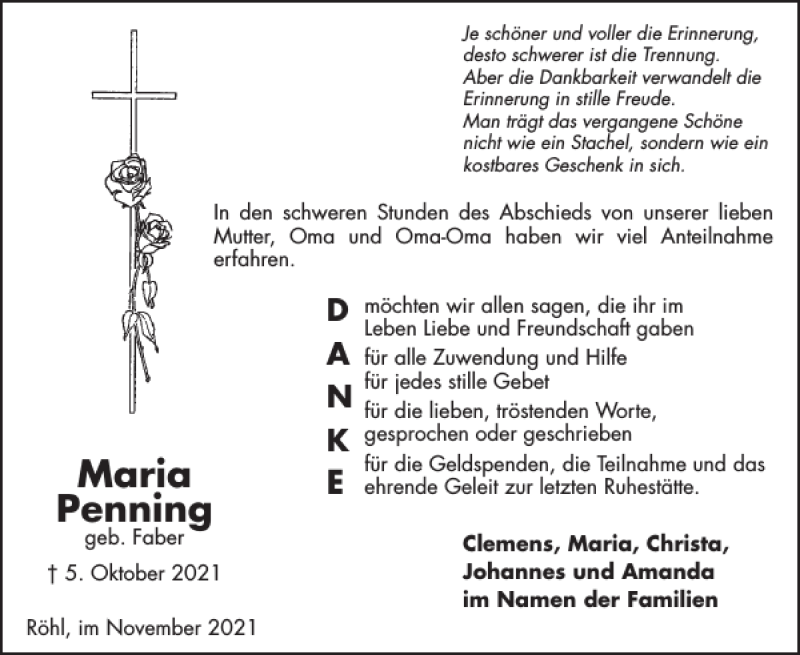Hier finden Sie alle Traueranzeigen aus der Zeitung, die bisher für Maria Penning erschienen sind. Weitere Traueranzeigen, die in der Zeitung erscheinen, werden hier ebenfalls aufgelistet
