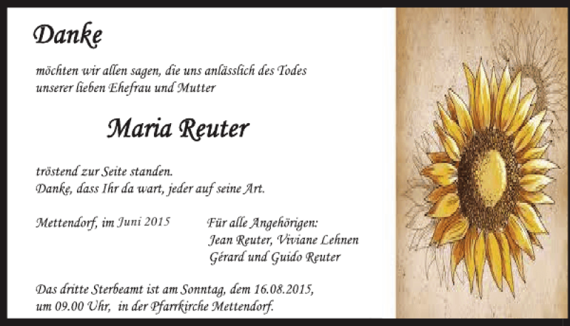 Hier finden Sie alle Traueranzeigen aus der Zeitung, die bisher für Maria Reuter erschienen sind. Weitere Traueranzeigen, die in der Zeitung erscheinen, werden hier ebenfalls aufgelistet