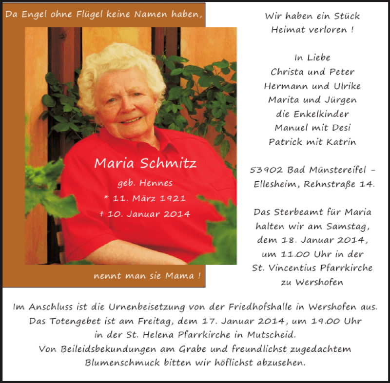 Hier finden Sie alle Traueranzeigen aus der Zeitung, die bisher für Maria Schmitz erschienen sind. Weitere Traueranzeigen, die in der Zeitung erscheinen, werden hier ebenfalls aufgelistet
