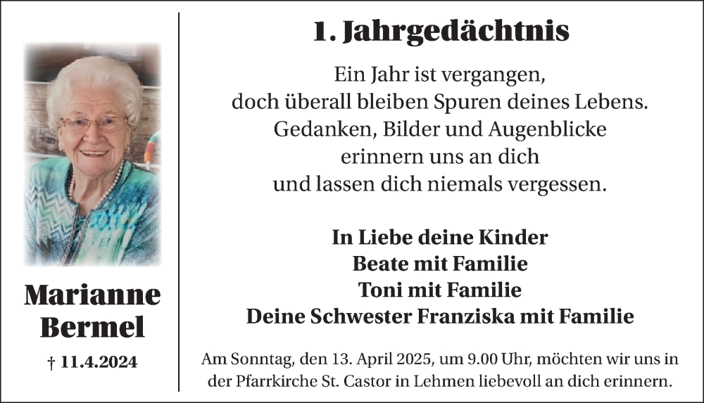 Hier finden Sie alle Traueranzeigen aus der Zeitung, die bisher für Marianne Bermel erschienen sind. Weitere Traueranzeigen, die in der Zeitung erscheinen, werden hier ebenfalls aufgelistet