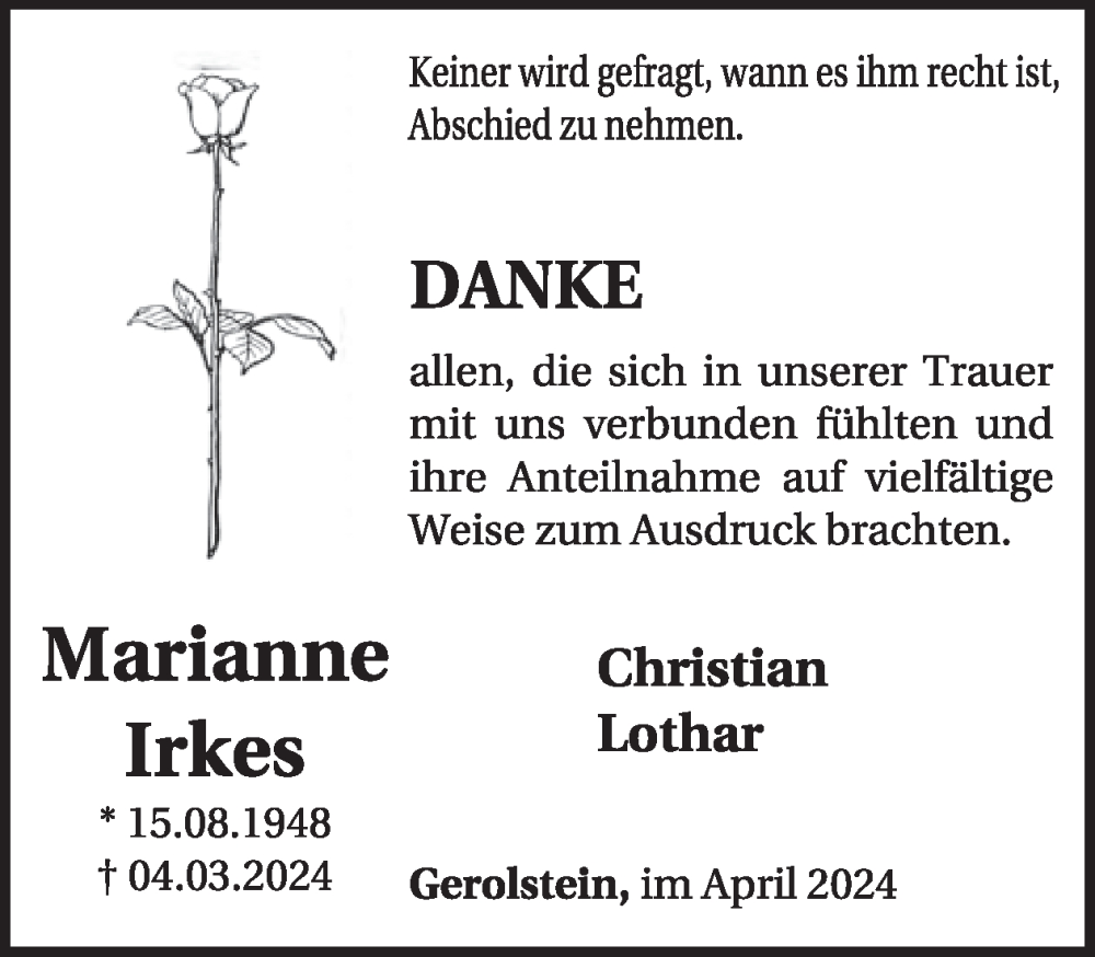 Hier finden Sie alle Traueranzeigen aus der Zeitung, die bisher für Marianne Irkes erschienen sind. Weitere Traueranzeigen, die in der Zeitung erscheinen, werden hier ebenfalls aufgelistet