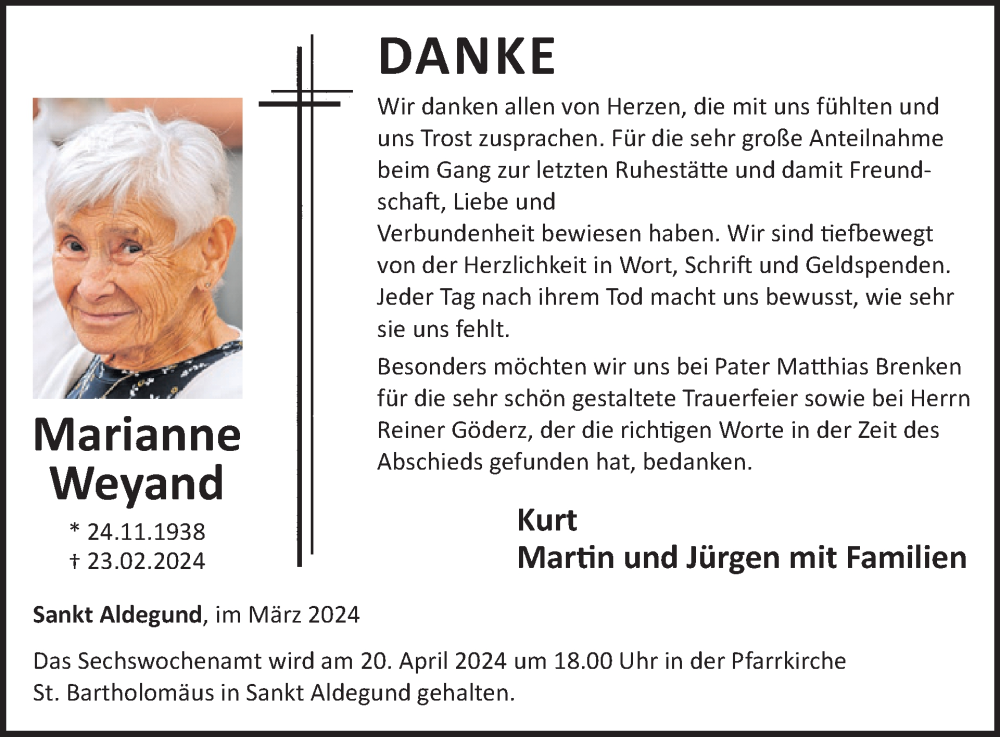Hier finden Sie alle Traueranzeigen aus der Zeitung, die bisher für Marianne Weyand erschienen sind. Weitere Traueranzeigen, die in der Zeitung erscheinen, werden hier ebenfalls aufgelistet