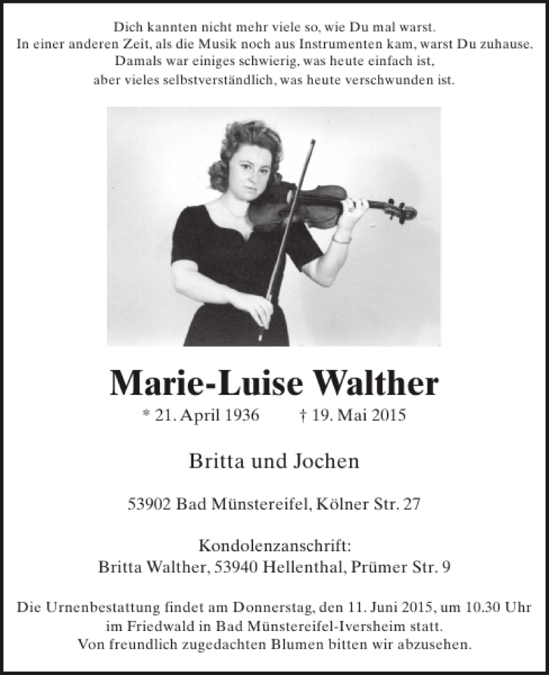 Hier finden Sie alle Traueranzeigen aus der Zeitung, die bisher für Marie-Luise Walther erschienen sind. Weitere Traueranzeigen, die in der Zeitung erscheinen, werden hier ebenfalls aufgelistet