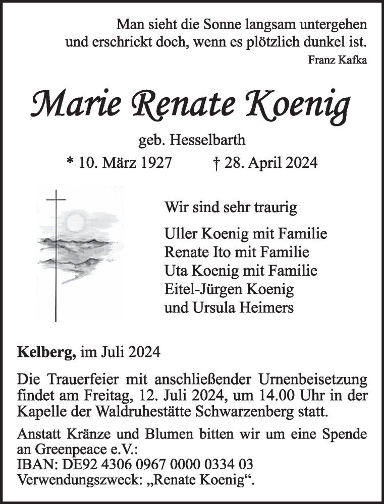 Hier finden Sie alle Traueranzeigen aus der Zeitung, die bisher für Marie Renate Koening erschienen sind. Weitere Traueranzeigen, die in der Zeitung erscheinen, werden hier ebenfalls aufgelistet