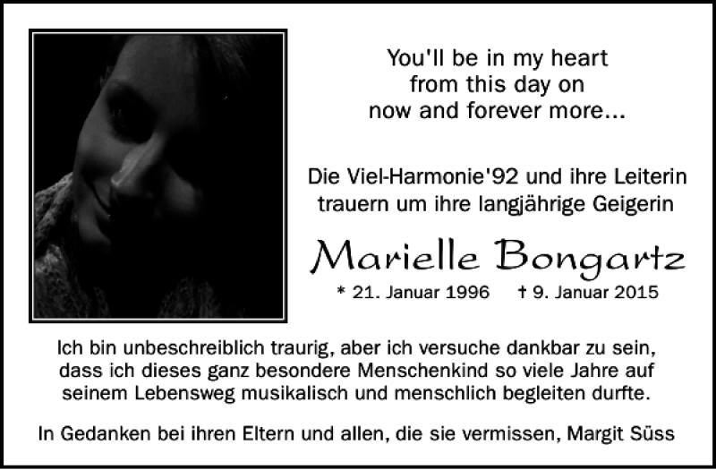 Hier finden Sie alle Traueranzeigen aus der Zeitung, die bisher für Marielle Bongartz erschienen sind. Weitere Traueranzeigen, die in der Zeitung erscheinen, werden hier ebenfalls aufgelistet