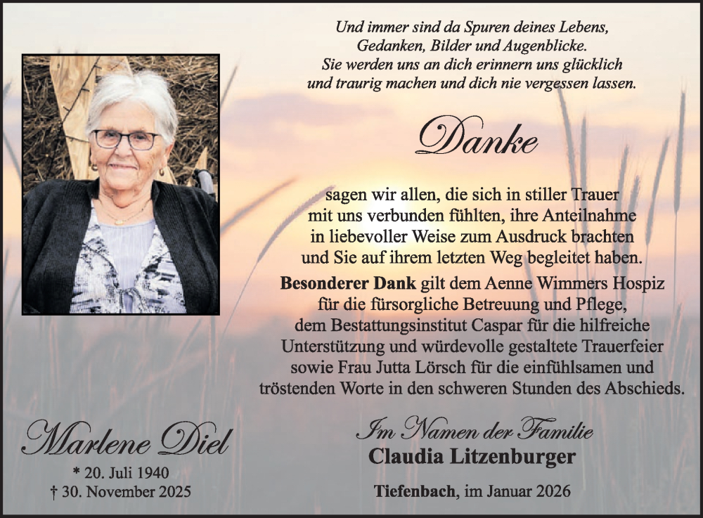 Hier finden Sie alle Traueranzeigen aus der Zeitung, die bisher für Marlene Diel erschienen sind. Weitere Traueranzeigen, die in der Zeitung erscheinen, werden hier ebenfalls aufgelistet