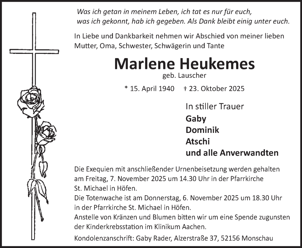 Hier finden Sie alle Traueranzeigen aus der Zeitung, die bisher für Marlene Heukemes erschienen sind. Weitere Traueranzeigen, die in der Zeitung erscheinen, werden hier ebenfalls aufgelistet