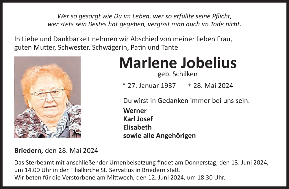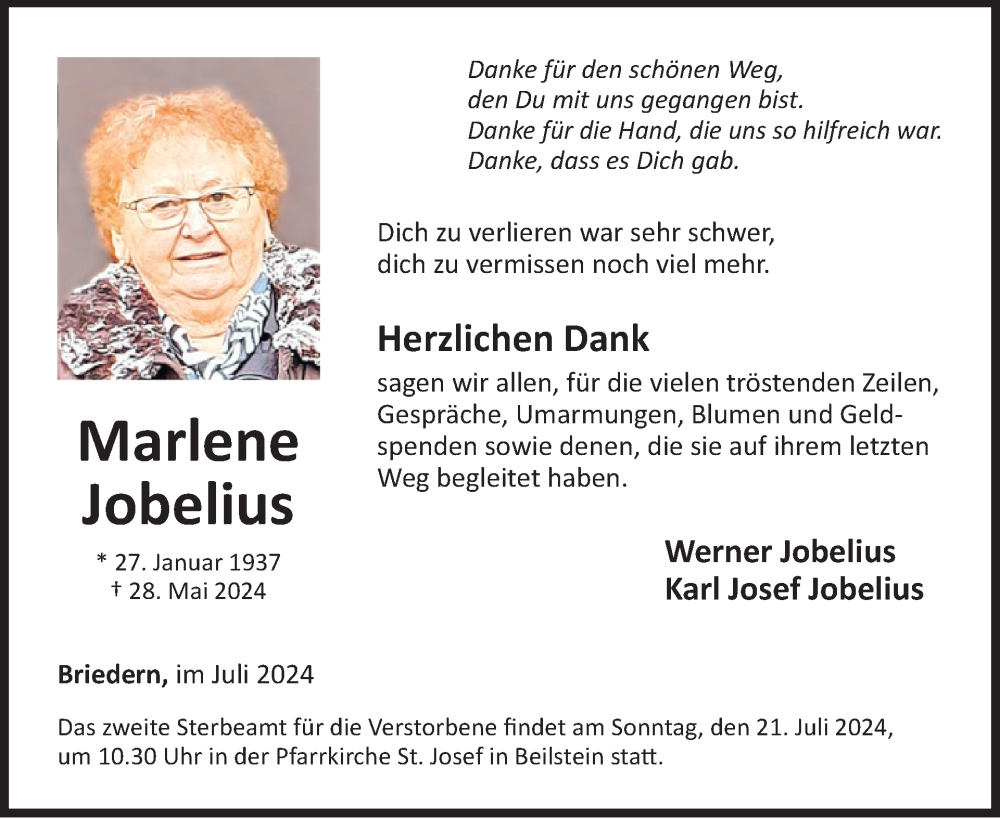Hier finden Sie alle Traueranzeigen aus der Zeitung, die bisher für Marlene Jobelius erschienen sind. Weitere Traueranzeigen, die in der Zeitung erscheinen, werden hier ebenfalls aufgelistet