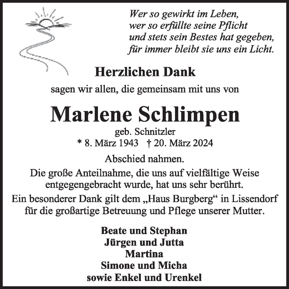 Hier finden Sie alle Traueranzeigen aus der Zeitung, die bisher für Marlene Schlimpen erschienen sind. Weitere Traueranzeigen, die in der Zeitung erscheinen, werden hier ebenfalls aufgelistet
