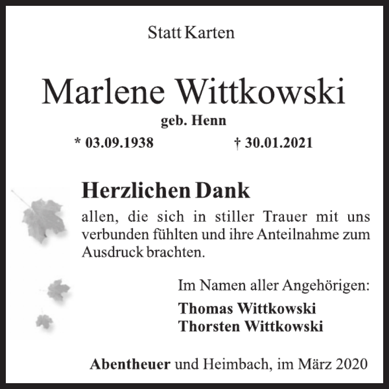 Hier finden Sie alle Traueranzeigen aus der Zeitung, die bisher für Marlene Wittkowski erschienen sind. Weitere Traueranzeigen, die in der Zeitung erscheinen, werden hier ebenfalls aufgelistet