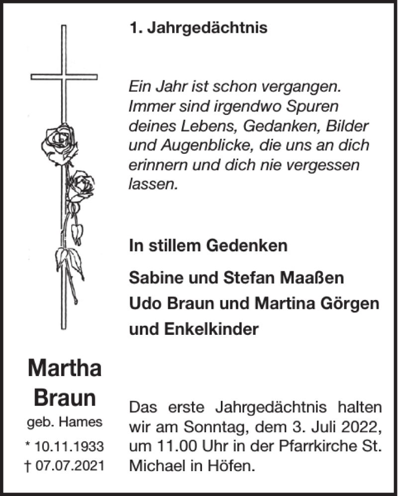 Hier finden Sie alle Traueranzeigen aus der Zeitung, die bisher für Martha Braun erschienen sind. Weitere Traueranzeigen, die in der Zeitung erscheinen, werden hier ebenfalls aufgelistet