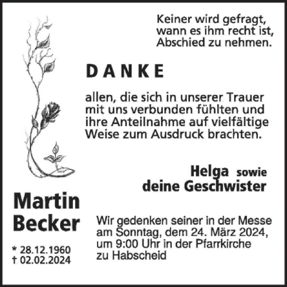 Hier finden Sie alle Traueranzeigen aus der Zeitung, die bisher für Martin Becker erschienen sind. Weitere Traueranzeigen, die in der Zeitung erscheinen, werden hier ebenfalls aufgelistet