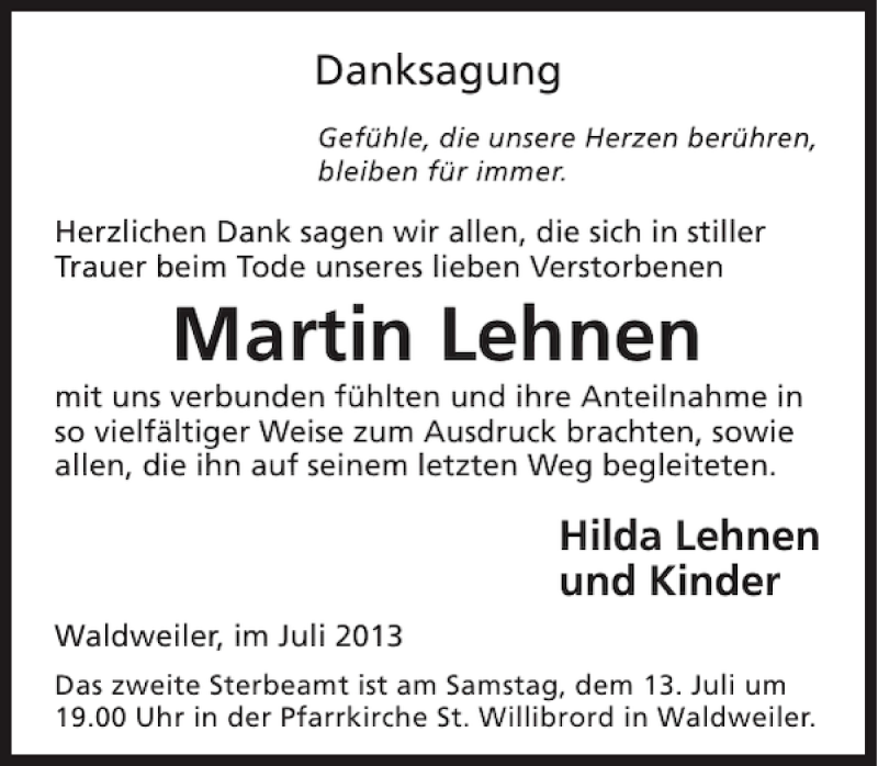 Hier finden Sie alle Traueranzeigen aus der Zeitung, die bisher für Martin Lehnen erschienen sind. Weitere Traueranzeigen, die in der Zeitung erscheinen, werden hier ebenfalls aufgelistet