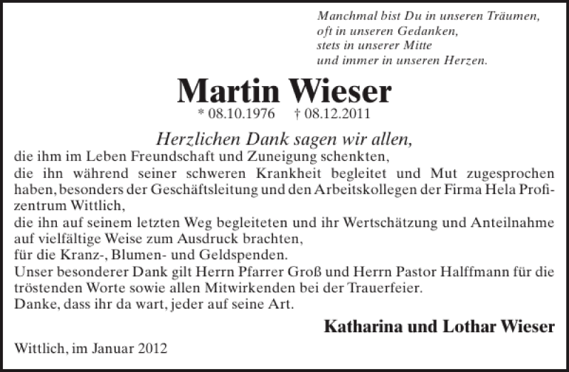 Hier finden Sie alle Traueranzeigen aus der Zeitung, die bisher für Martin Wieser erschienen sind. Weitere Traueranzeigen, die in der Zeitung erscheinen, werden hier ebenfalls aufgelistet