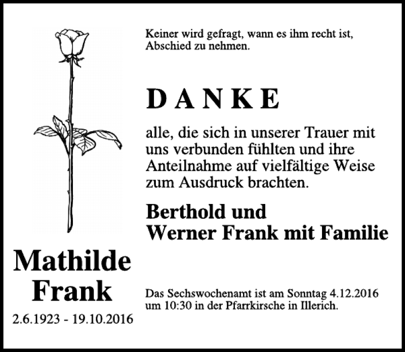 Hier finden Sie alle Traueranzeigen aus der Zeitung, die bisher für Mathilde Frank erschienen sind. Weitere Traueranzeigen, die in der Zeitung erscheinen, werden hier ebenfalls aufgelistet