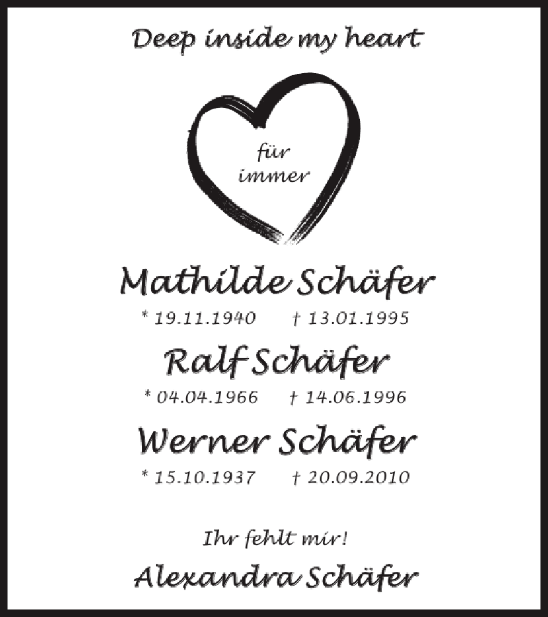 Hier finden Sie alle Traueranzeigen aus der Zeitung, die bisher für Mathilde Schäfer Ralf Schäfer Werner Schäfer erschienen sind. Weitere Traueranzeigen, die in der Zeitung erscheinen, werden hier ebenfalls aufgelistet
