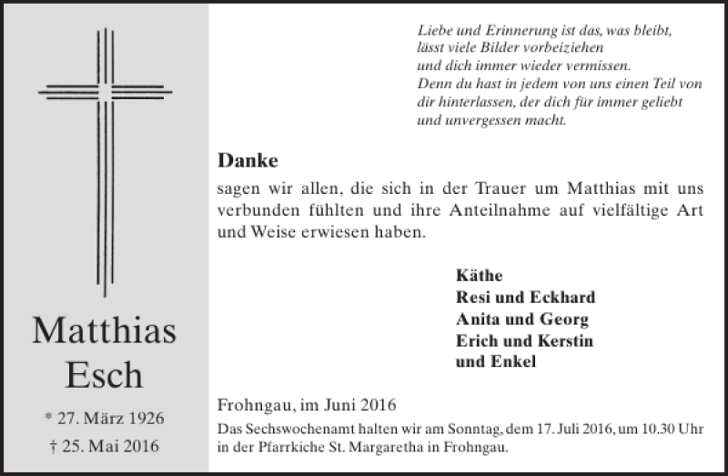 Hier finden Sie alle Traueranzeigen aus der Zeitung, die bisher für Matthias Esch erschienen sind. Weitere Traueranzeigen, die in der Zeitung erscheinen, werden hier ebenfalls aufgelistet