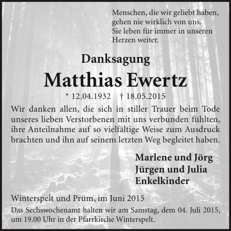 Hier finden Sie alle Traueranzeigen aus der Zeitung, die bisher für Matthias Ewertz erschienen sind. Weitere Traueranzeigen, die in der Zeitung erscheinen, werden hier ebenfalls aufgelistet