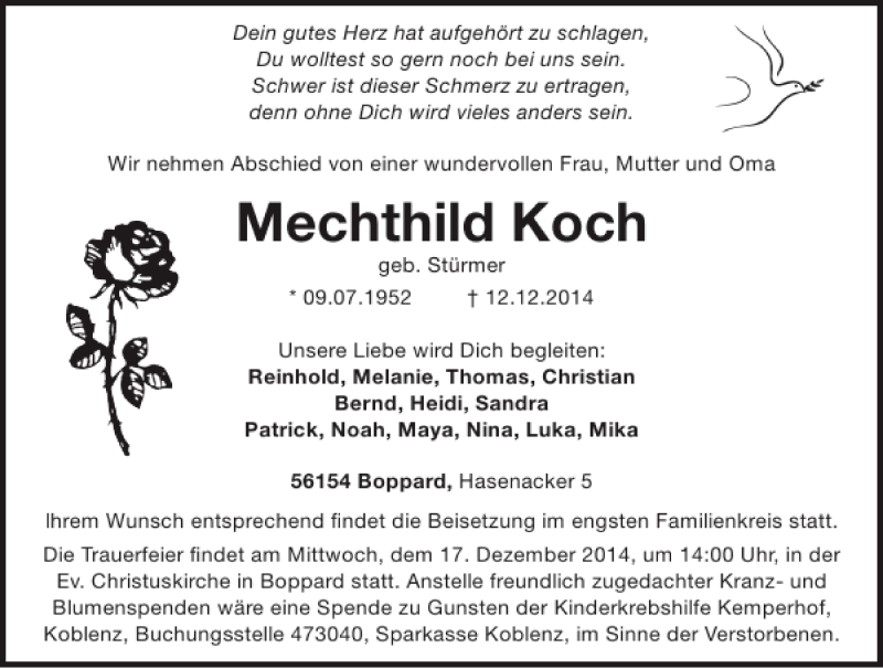 Hier finden Sie alle Traueranzeigen aus der Zeitung, die bisher für Mechthild Koch erschienen sind. Weitere Traueranzeigen, die in der Zeitung erscheinen, werden hier ebenfalls aufgelistet