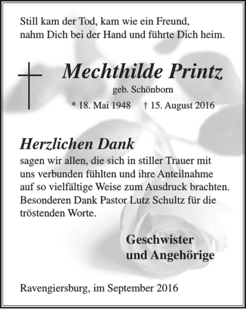 Hier finden Sie alle Traueranzeigen aus der Zeitung, die bisher für Mechthilde Printz erschienen sind. Weitere Traueranzeigen, die in der Zeitung erscheinen, werden hier ebenfalls aufgelistet